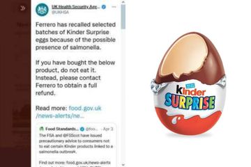 As a precautionary measure Ferrero has recalled the products and people. The batches being recalled are the Kinder Surprise 20g egg and the Kinder Surprise 20g three-pack of eggs with best before dates between 11 July 2022 and 7 October 2022. In an alert the agency said the recall is due to a potential link to a salmonella outbreak.